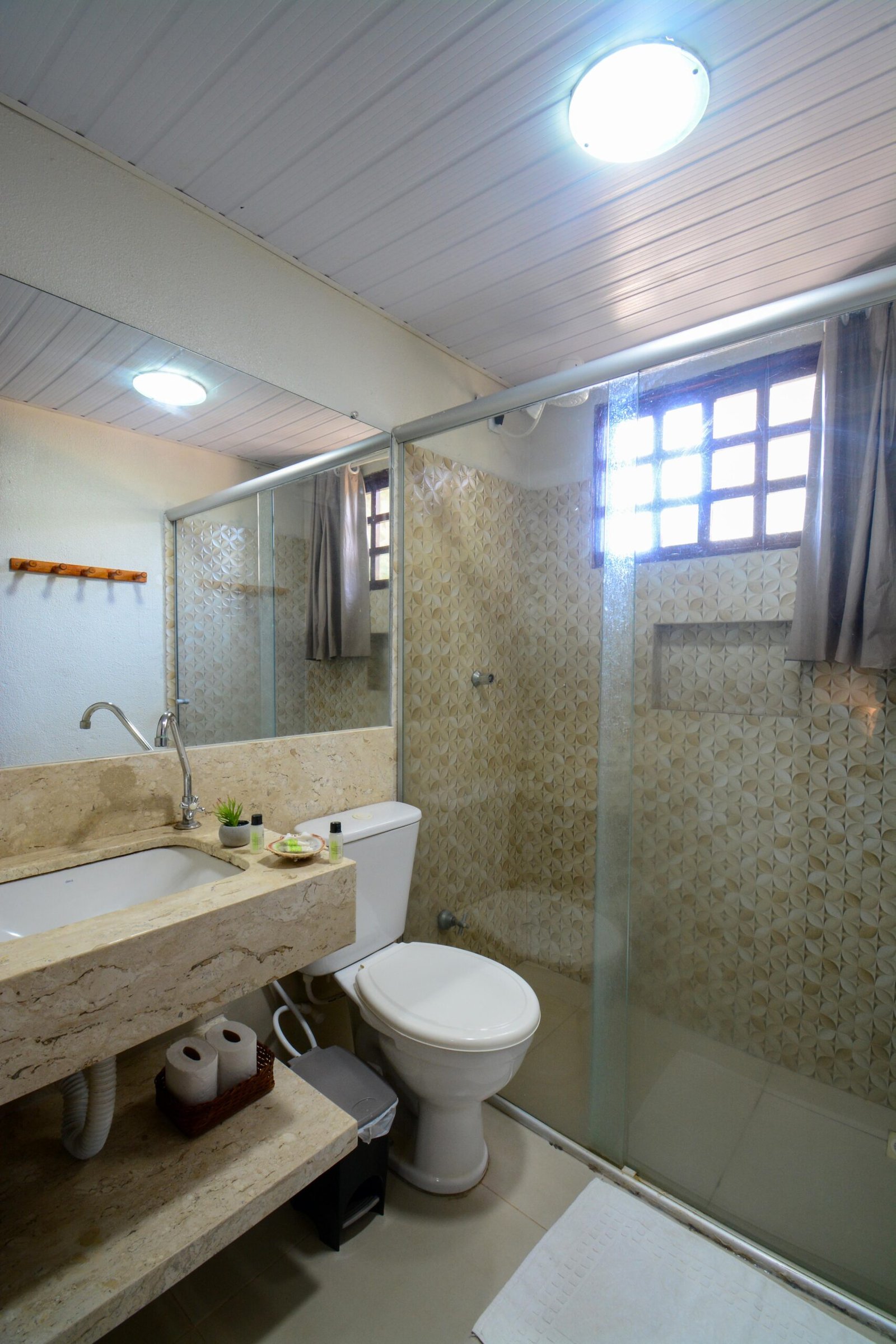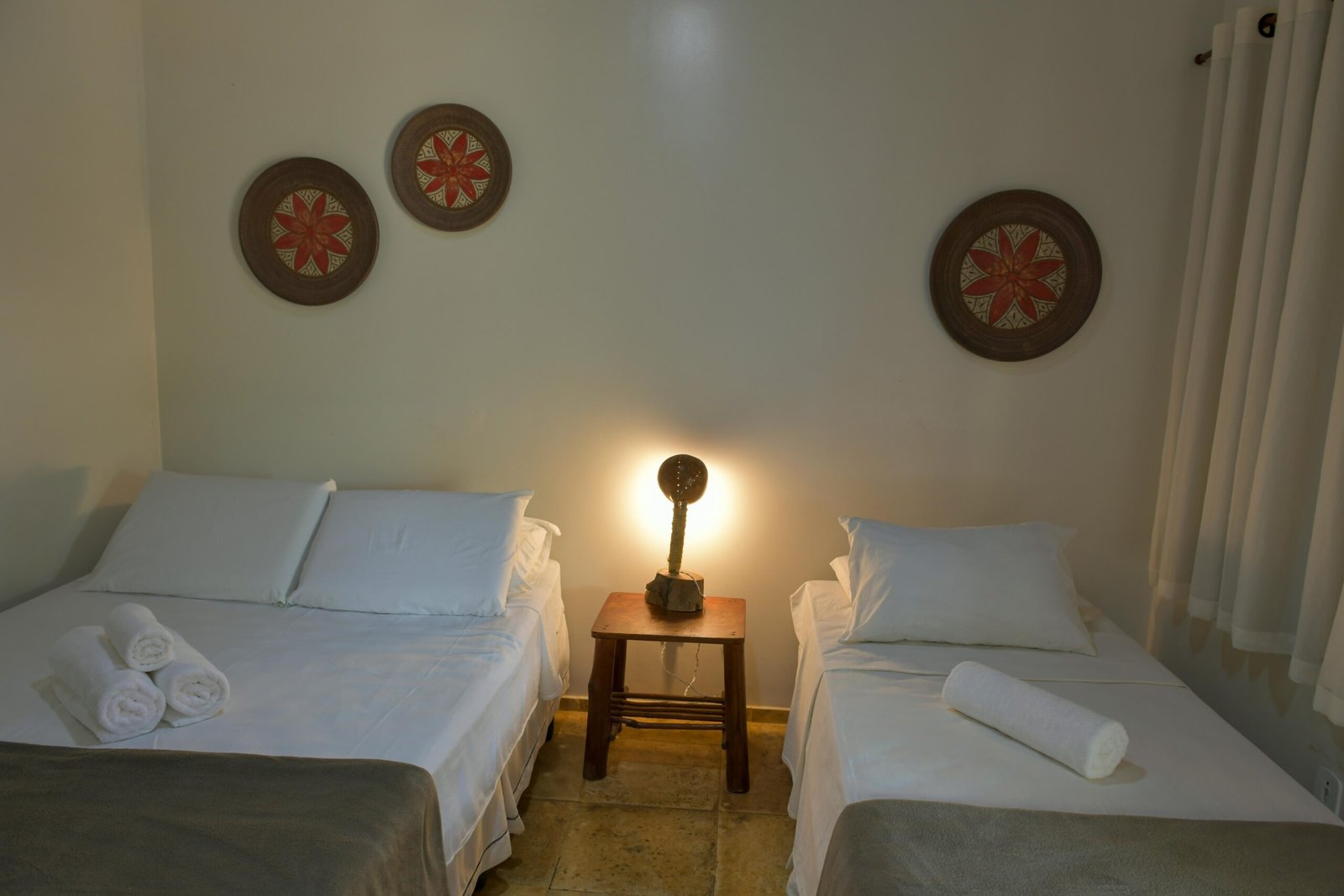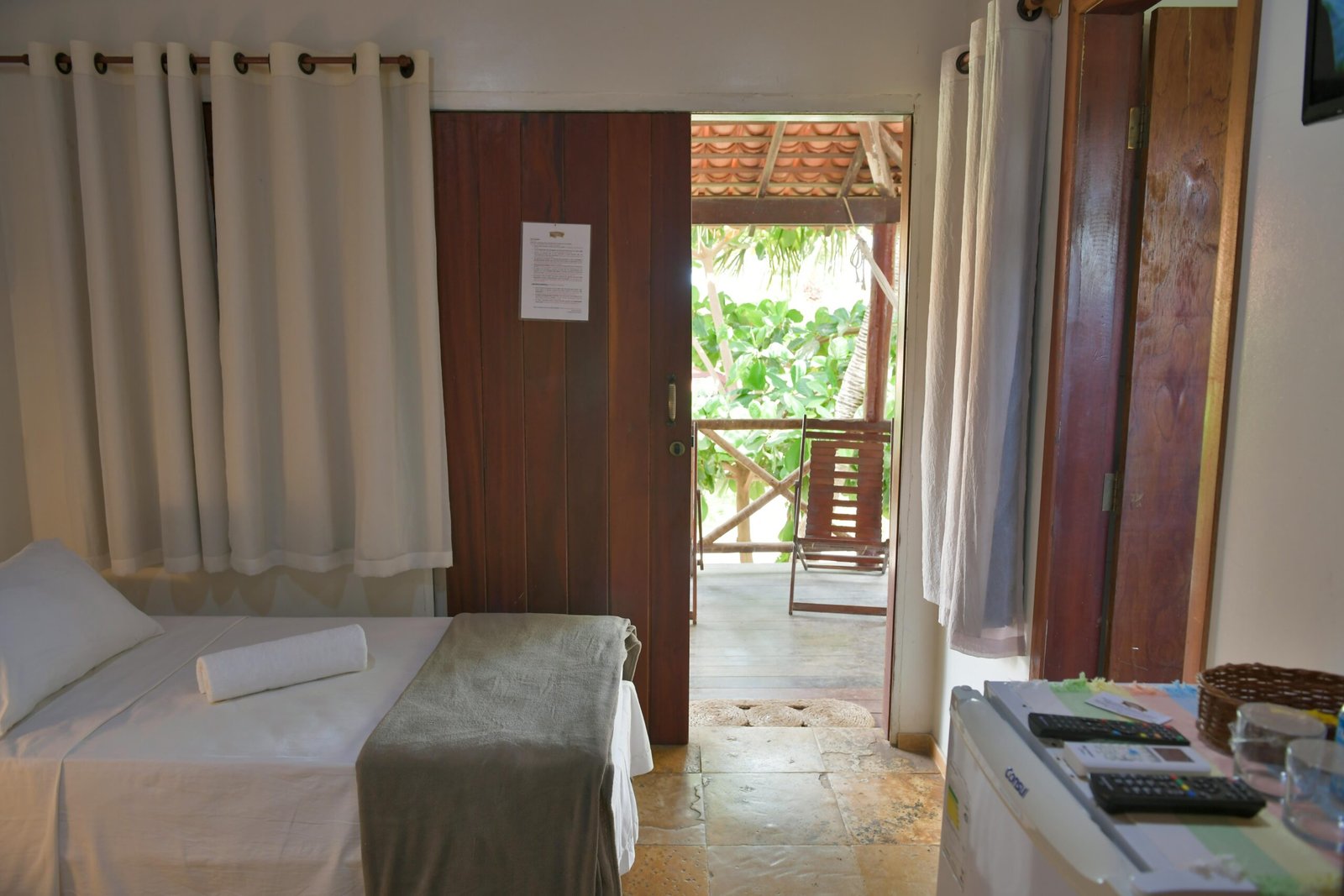 Opções localizadas no piso superior ou piso térreo com 1 cama casal e 1 cama solteiro, ar condicionado split, TV, frigobar, banheiro com chuveiro elétrico e varanda privativa.