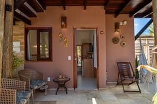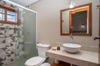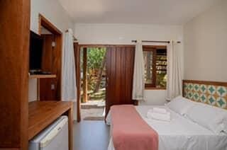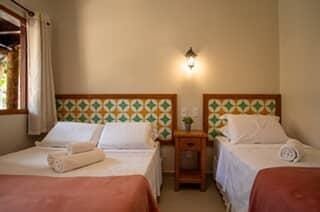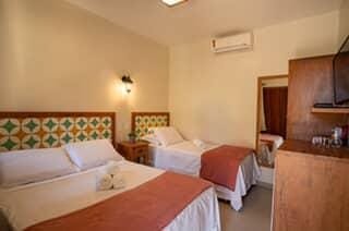 Opções localizadas no piso superior ou piso térreo com 1 cama de casal e 1 cama de solteiro, ar condicionado split, TV, frigobar, banheiro com chuveiro elétrico e varanda.