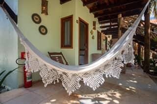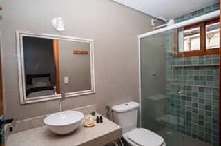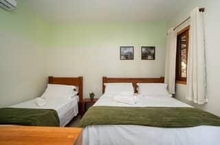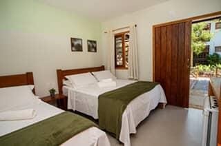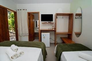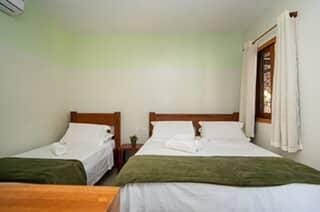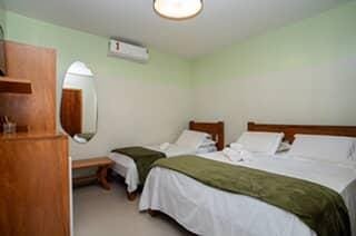 Opções localizadas no piso superior ou piso térreo com 1 cama de casal QUEEN e 1 cama de solteiro, ar condicionado split, TV, frigobar, banheiro com chuveiro elétrico e varanda.
