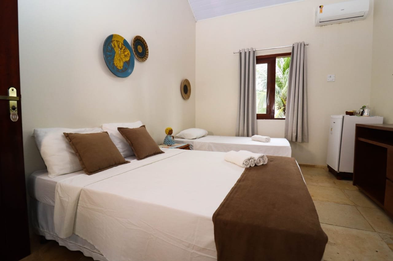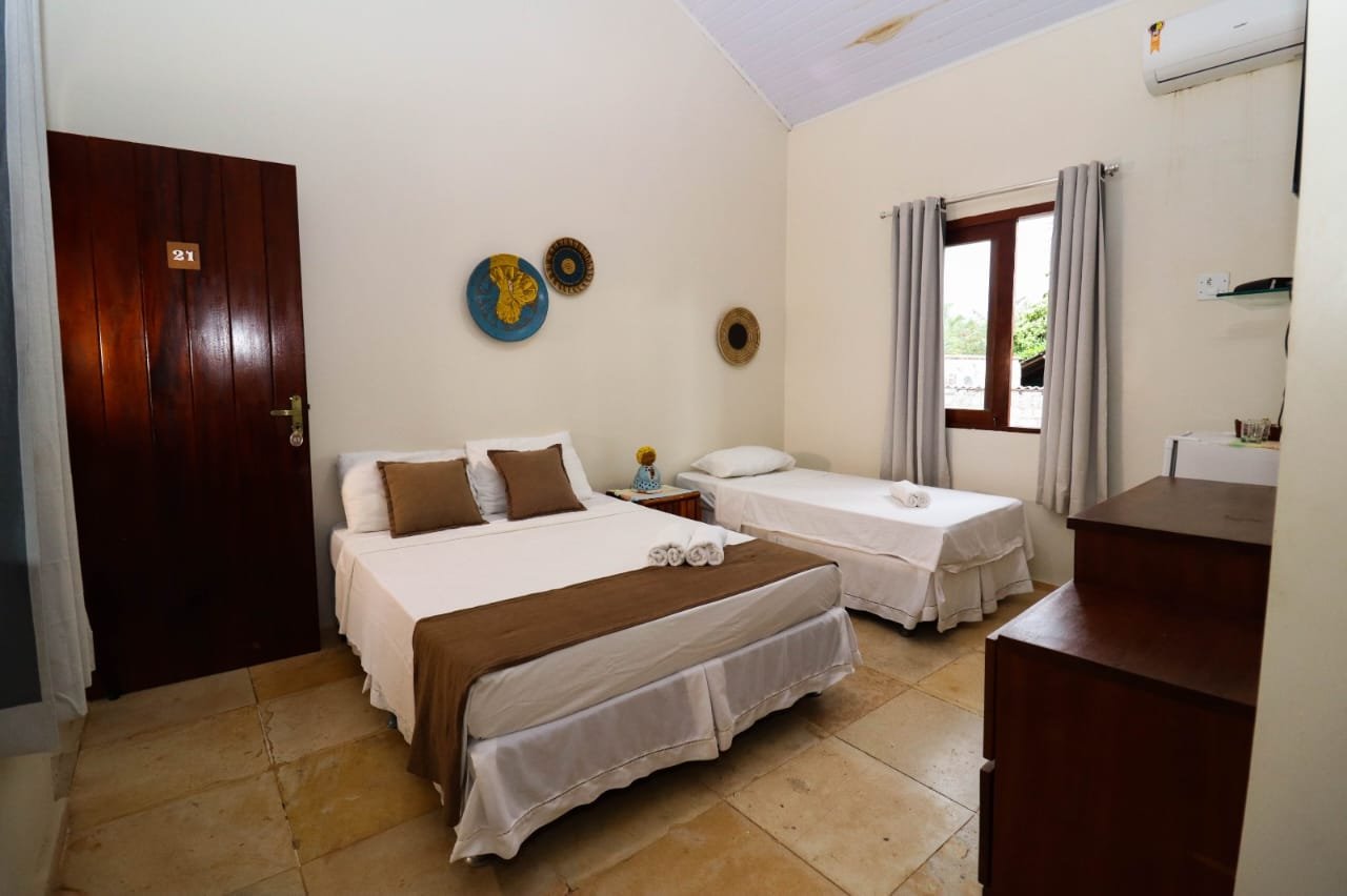 Suíte STANDARD piso superior com 1 cama de casal + 1 cama de solteiro, ar condicionado, TV, frigobar, banheiro com chuveiro elétrico e varanda.